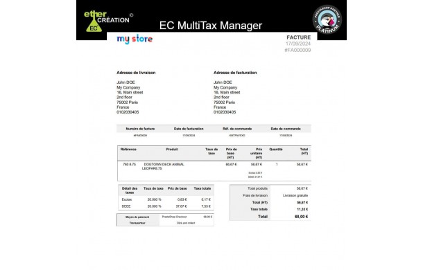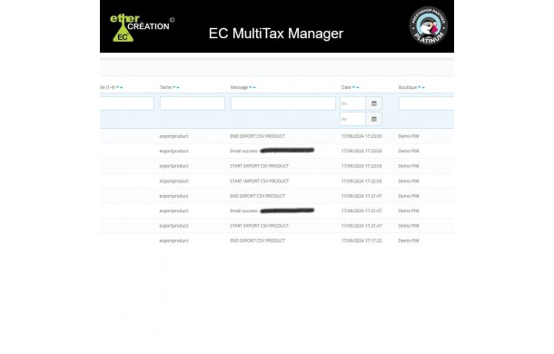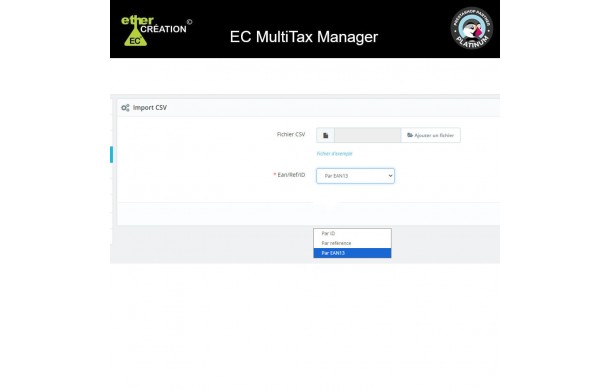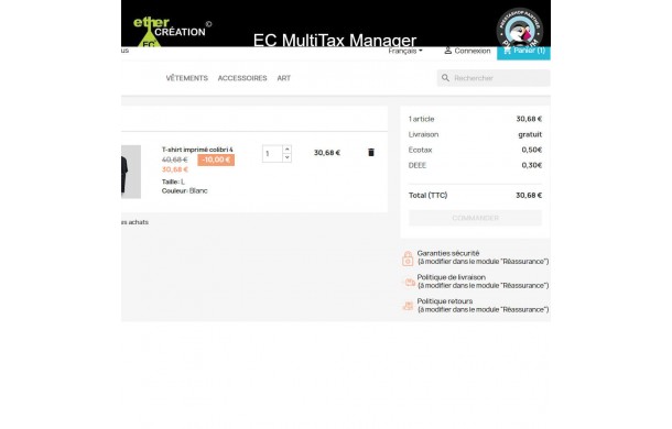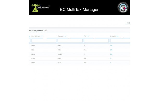 EC MultiTax Manager simplifies the management of your taxes (such as DEEE, Sorecop, Ecotax, ASL, etc.) in an intuitive way. You can import and export CSV files, display taxes on the cart, product sheets, and invoices, as well as export your orders with a detailed breakdown of taxes.