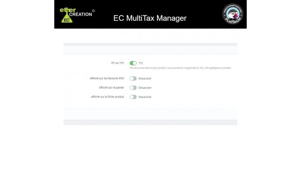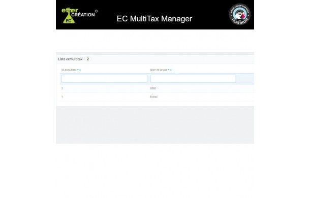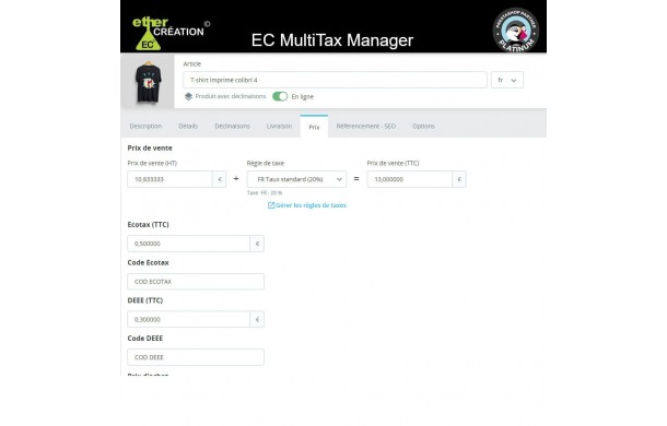 EC MultiTax Manager is a powerful module designed to simplify the management of all your specific taxes (ASL, DEEE, Sorecop, Ecotax, etc.) directly within PrestaShop. It allows you to add, modify, and delete taxes associated with your products while centralizing their management with numerous configuration options.